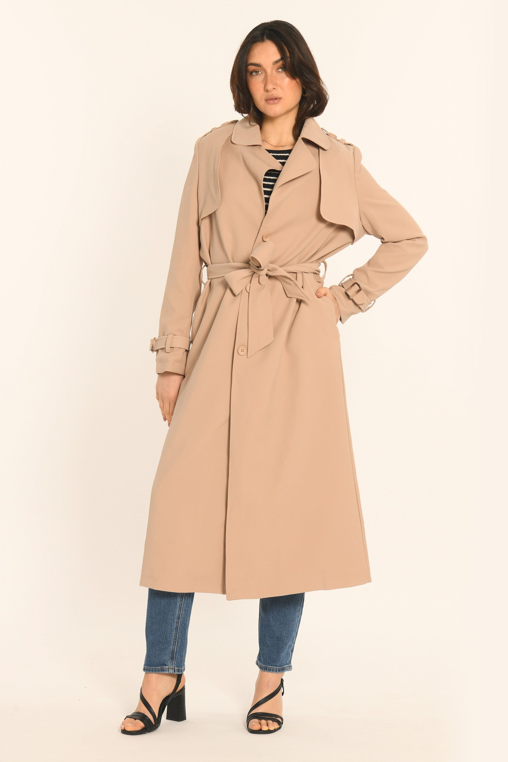 Pour un trench long beige ceinturé au tombé élégant, comment savoir si la coupe conviendra vraiment à une silhouette adulte plutôt active au quotidien ?